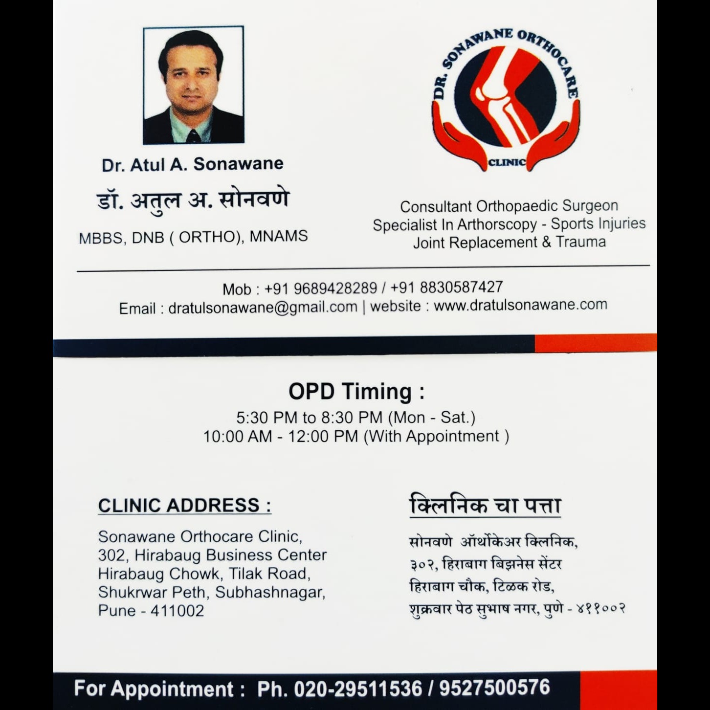 At Dr Sonawane Orthocare, we provide comprehensive orthopedic care to help you recover faster and live pain-free. 🔹 Joint Pain & Arthritis Treatment 🔹 Fracture & Trauma Care 🔹 Knee & Hip Joint Replacement 🔹 Ligament & Sports Injury Treatment 🔹 Arthroscopy (Minimally Invasive Surgery) 🔹 Back, Neck & Spine Care 👨⚕️ Dr. Atul Sonawane Orthopedic Surgeon | Trauma, Joint Replacement & Arthroscopy Specialist ✨ Trusted care. Modern treatment. Better mobility. 📍 Clinic Address: Dr. Sonawane Orthocare Clinic, HBC building, 302, Hirabaug Chowk. Tilak road, Shukrawar peth, Swargate, Pune- 411002 www.sonawaneorthocare.com 📞 Call / WhatsApp: 9527500576 🕒 OPD Timings: 10.00am-2.00pm and 5.30pm-8.30pm #DrSonawaneOrthocare #OrthopedicClinic #BoneAndJointCare #JointPainRelief #KneePainTreatment #FractureCare #PainFreeMovement